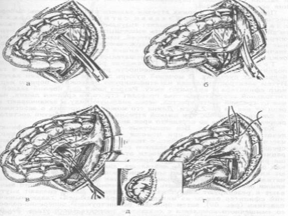 Рис.68.а, б, в, г, д. Техніка створення протиприродного заднього проходу.