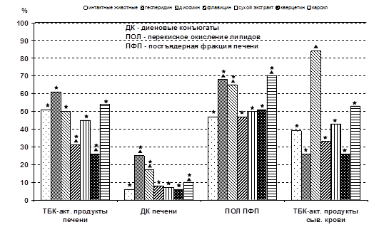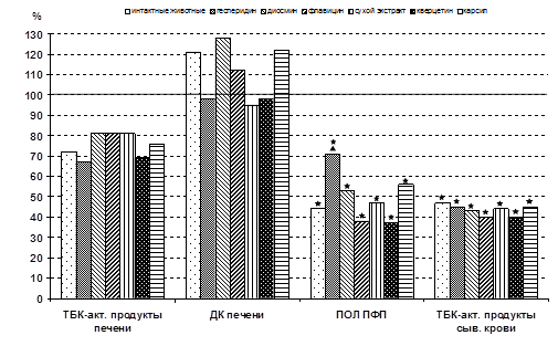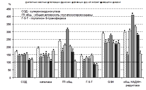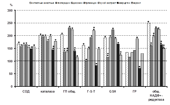 и этанолом индивидуальные флавоноиды, а также СЭ и карсил отличаются по влиянию на ферментативное звено АОЗ. Флавицин и СЭ способствуют нормализации практически всех показателей АОС, стимулируя активности ферментов, участвующих в регенерации НАДФН2