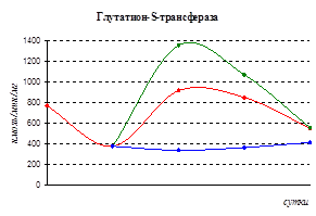 При лечебном применении СЭ наблюдалась более выраженная активация ГП и Г-S-ТР. В то же время у животных, леченных карсилом, отсутствовала активация Г-S-ТР и наблюдалась менее выраженная активация ГП. В результате уже через 14 дней лечения сухим экстрактом наблюдалась полная нормализация содержания продуктов ПОЛ, в то время, как при лечении карсилом нормализация их содержания происходила только к окончанию срока лечения.