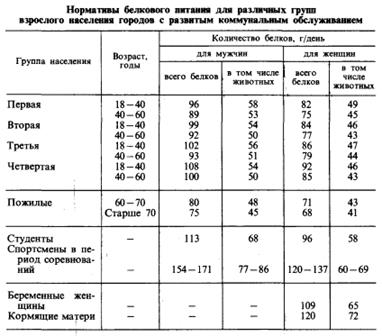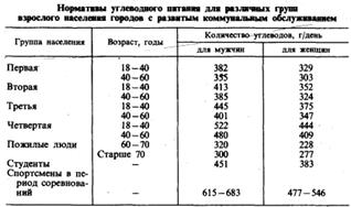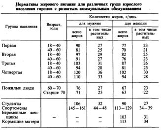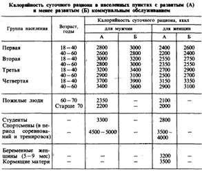 Определенное снижение метаболизма и значительное изменение трудовой деятельности обычно наблюдается у людей пожилого и особенно преклонного возраста, что должно обусловливать закономерное уменьшение калорийности их рациона. Известные различия в суточном калораже находятся в зависимости от бытовых условий жизни населения, причем в городах с развитым коммунальным обслуживанием отмечается понижение энергетических трат организма благодаря наличию водопровода, канализации, центрального отопления, системы общественного транспорта и др. Это объясняет большую величину соответствующих показателей, рекомендуемых для сельских жителей. Наконец, при оценке калорийности питания взрослого населения учитывают занятия физкультурой и спортом, а также другие формы активного отдыха, повышающие энергетическую потребность человека примерно на 200-300 ккал.