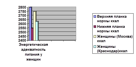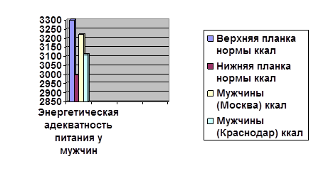 Анализ данной диаграммы позволяет сказать, что сравнительная характеристика энергетической адекватности рациона мужчин Москвы ближе к верхней планке нормы, а рацион мужчин Краснодара находится в среднем диапазоне нормы потребляемых килокалорий.