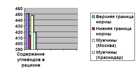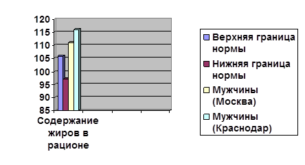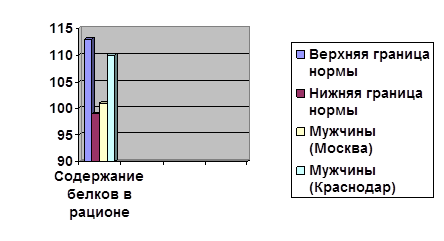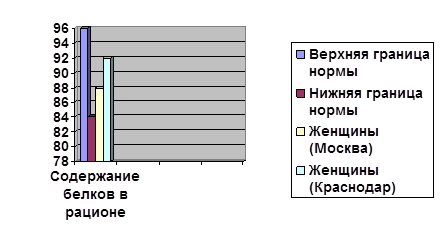 Анализ данной диаграммы позволяет сделать вывод о том, что энергетически питание обеих групп находится в пределах нормы. Однако следует сказать, что у женщин Москвы наблюдается приближение к верхней границе допустимой нормы, что при снижении физической нагрузки может стать избыточно-калорийным питанием.