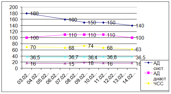 В результате проведенного лечения состояние больного улучшилось – приступов стенокардии не наблюдалось, АД снизилось до 140/100.