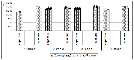 В цілому за чотири роки навчання відмічалося зростання функціональних можливостей дітей, однак звертає увагу несинхронність їх дозрівання та наявність критичних періодів у формуванні. З’ясовані більш низькі показники розумової працездатності учнів, та більша кількість помилок порівняно з даними інших досліджень (Гребняк Н.П. та ін., 2001; Лапонова Е.Д., 2001), дуже висока частка патологічних реакцій (переважно астенічного типу) за результатами проби Мартине у співставленні з оцінками 90-х років (Гилеп Т.Ю., 1990; Тихвинский С.Б., Хрущев С.В., 1991; Симонова О.И. та ін., 2001).