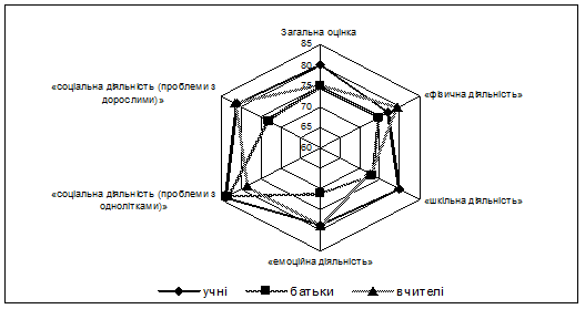 Загальний показник ЯЖПЗ складав (80,4 ± 0,6) % за оцінкою дітей, (74,7 ± 0,8) % за оцінками батьків та (75,6 ± 0,6) % за оцінкою вчителів. Тобто дорослі суттєво нижче оцінювали якість життя дітей (р<0,05). Найбільш високими показники дітей були за шкалами «соціальна діяльність (однолітки)», низькими за шкалами «фізична діяльність» та «емоційна діяльність». Найбільша невідповідність оцінки ЯЖПЗ батьків і дітей була за шкалами – «шкільна діяльність», «емоційна діяльність» та «соціальна діяльність (дорослі)», дітей та вчителів – «соціальна діяльність (однолітки)» та «шкільна діяльність». Ці шкали діти оцінили краще, ніж дорослі.