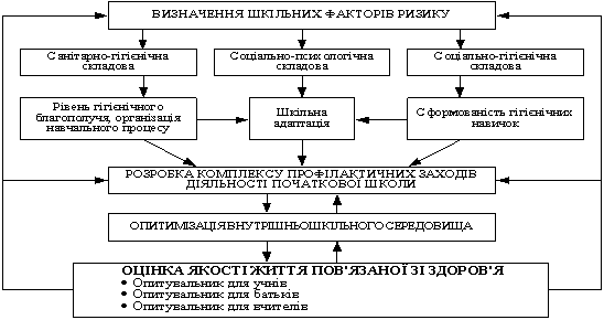 The dissertation is dedicated to substantiation of hygienic approaches to prophylaxis of negative influence of intraschool factors on quality of life and health of junior schoolchildren. The dynamics of health state of schoolchildren of primary school is established in the thesis, as well as the influence of intraschool environment factors at the level of the form. Quality of life health related of junior schoolchildren is studied, as an indicator of influence of school environment. A conceptual model of management for health of pupils of primary school is substantiated, which is based on detailing three levels – strategic, tactic and operative. The algorithm of management for health at the operative level is elaborated. The preventive measures on optimization of effect of guided intraschool factors are introduced and their efficiency is estimated.