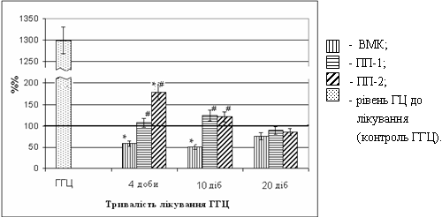 Через 10 діб лікування ВМК мікроскопічна будова нирок практично не відрізнялась від контролю, а у тварин, що лікувалися препаратом ПП-1 – майже нормалізувалася: спостерігались незначний мезангіальний набряк та залишкові дегенеративні процеси у канальцевому епітелії. Через 20 діб лікування тварин з ГМГ введенням ВМК та ПП-1 будова нирок не відрізнялася від контролю. При застосування ОД явні патологічні зміни в нирках відмічалися навіть через 20 діб лікування.