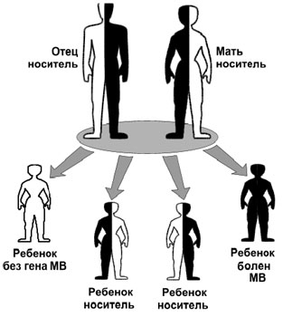 Муковисцидоз наследуется по аутосомно-рецессивному типу. Так как оба родителя гетерозиготны по аномальному гену МВТР и, следовательно, являются лишь его носителями, вероятность рождения ребенка с МВ равна 25% (рис.1). При каждой последующей беременности этот показатель риска остается неизменным: "риск не имеет памяти".
