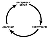 Железы слизистой, выстилающей респираторные пути, вырабатывают большое количество вязкого секрета, который, скапливаясь в просвете бронхов, приводит к полной обтурации мелких бронхиол. В результате инфицирования неподвижной и вязкой слизи патогенной микрофлорой развивается гнойное воспаление. Соответственно слизистый секрет замещается гнойным. Вследствие нарушения естественного пассажа мокроты, который осуществляется движениями реснитчатого эпителия ("цилиарного эскалатора"), нарастает обструкция, что ведет к интенсификации инфекционного процесса и формированию порочного круга: обструкция-инфекция-воспаление.