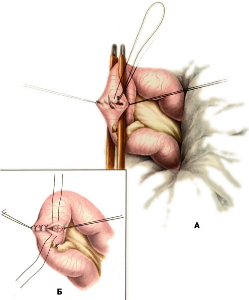 Рис. 4. Резекция дивертикула Меккеля. Ушивание дефекта в стенке кишки двухрядным швом: а — наложение скорняжного шва; б — наложение узловых серозно-мышечных швов.