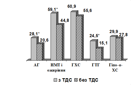 Найпоширенішим із ліпідних порушень є ГХС: гранично підвищений рівень ХС (200-239 мг/дл) зареєстровано у 33,9 %, високий – у 18,9 % осіб. Середньопопуляційні значення загального ХС перевищують нормальний рівень, починаючи вже з 35-річного віку – (205,7 ± 2,9) мг/дл.