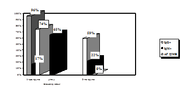 Визначення класів Ig показало, що 96+0,82% зразків сироваток крові дітей 1-ої групи містили IgG, у той час, як у дітей 2-ої групи вони були зафіксовані у 59+0,49% обстежених (рис. 1). Найбільшу зацікавленість представили результати виявлення анти-ЦМВ IgМ, які розглядались як показник початкової стадії або гострої форми інфекції. IgМ були виявлені в сироватках крові 17+0,47% дітей з клінічними ознаками та у 22+0,51% дітей без клінічних ознак ЦМВІ (p<0,05). Швидким культуральним методом у дітей першої групи антиген ЦМВ було виявлено у 17 осіб, що складало 74%. Тоді як у дітей другої групи антиген ЦМВ виявлено не було. Останнє свідчить про високий рівень безсимптомних форм цитомегаловірусної інфекції, і спостерігається навіть у її гострій формі.