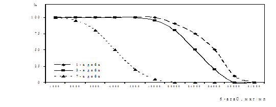 Дослідження антивірусної активності 6-аzaC. Вивчали цитотоксичність 6-azaC у культурі ФЛЕЛ за дією на життєздатність клітин використовуючи барвник трипановий синій. Було встановлено, що на 3-ю добу культивування клітин з 6-azaC у концентраціях від 50000 мкг/мл до 30000 мкг/мл життєздатних клітин у дослідах не спостерігалось. У присутності 6-azaC у концентрації 26000 мкг/мл кількість життєздатних клітин складала - 20% від контролю клітин, а при концентрації 20000 мкг/мл - 80%. 6-azaC у концентрації 10000 мкг/мл виявляв незначну цитотоксичну дію, кількість життєздатних клітин складала - 95%. Нижчі концентрації 6-azaC на життєздатність клітин протягом 3-х діб культивування не впливали. Отримані результати представлені на рис. 4. Життєздатність клітин у 100% зберігалася протягом 7-и діб у присутності у концентрації 2000 мкг/мл, і протягом 10-и діб при концентраціях речовини 500 мкг/мл – 100 мкг/мл. Розрахунки зроблені за графіком показали, що цитотоксична доза (СD50)6-azaC, тобто така, що не спричиняла незворотніх змін у морфології та життєздатності клітин на 3-ю добу складала – 24000 мкг/мл.
