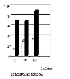 ) при ІМ 0,001 БУО/кл складає 100 мкг/мл, при ІМ 0,0001 БУО/кл - 50 мкг/мл (рис. 6). При концентрації 6-azaC 10 мкг/мл і нижче інгібуючого ефекту не спостерігалось. ІS для 6-azaC у терапевтичній схемі при ІМ 0,001 БУО/кл складав 24, а при ІМ 0,0001БУО/кл – 48.