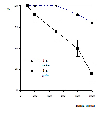 Дію амізону на синтез ДНК клітин ФЛЕЛ з використанням методу мічення клітинної ДНК, досліджували в концентраціях 1 мкг/мл, 10 мкг/мл, 100 мкг/мл, 800 мкг/мл та 1000 мкг/мл (рис. 9). Підрахунок клітин, що містили ³Н-ТД-мітку, показав, що у культурі, не обробленій амізоном, через добу 30% клітин перебували у стадії синтезу ДНК. У процесі культивування кількість мічених клітин у контрольній культурі поступово знижувалась. Через три доби їх кількість становила 12%. У культурі, обробленій амізоном у концентраціях від 1 мкг/мл до 10 мкг/мл, число клітин, що містили ³Н-ТД-мітку, через добу культивування незначно відрізнялось від контролю. При концентраціях препарату 100 мкг/мл та 800 мкг/мл число мічених клітин щодо контролю становило 60% і 30% відповідно. Через три доби число клітин, що синтезують ДНК, знизилось щодо контрольної популяції на 50% у присутності 100 мкг/мл амізону, при концентрації 800 мкг/мл на 100%. Таким чином, отримані дані показали, що на 3-ю добу 50% зниження числа клітин, що синтезують ДНК (CD50), відбувається при концентрації амізону 100 мкг/мл.