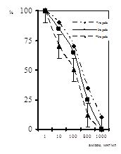 по осі ординат- % життєздатних клітин від контролю клітин,