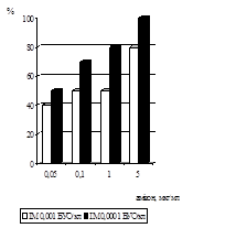 Дослідження впливу амізону на репродукції ЦМВ у профілактичній схемі було вивчено в присутності препарату у концентраціях 5 мкг/мл, 1 мкг/мл, 0,1 мкг/мл, 0,05 мкг/мл, з ІМ вірусу 0,0001 БУО/кл й 0,001 БУО/кл (рис. 10). Присутність амізону у концентрації 5 мкг/мл при зараженні ЦМВ із ІМ 0,0001 БУО/кл приводила до пригнічення вірусоспецифічної ЦПД через 5 діб на 90%, з ІМ 0,001 БУО/кл - на 70%. Амізон у концентрації 1 мкг/мл інгібував здатність вірусу до утворення антигенвмісних включень при ІМ 0,0001 БУО/кл на 70%, при ІМ 0,001 БУО/кл на 40%. Зменшення цитопатичної дії ЦМВ із ІМ 0,0001 БУО/кл було виявлено при концентрації 0,1 мкг/мл на 60%, із ІМ 0,001 БУО/кл - на 40%. Амізон у концентрації 0,05 мкг/мл інгібував здатність вірусу до утворення антигенвмісних включень при ІМ 0,0001 БУО/кл на 40% та при ІМ 0,001 БУО/кл на 30%.