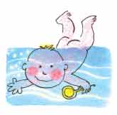 На этом этапе осваиваются погружения ребенка под воду без предварительных поливов. В положении поддержки "под подбородок" покачивать малыша в ритме его дыхания и в тот момент, когда он сделал вдох, на короткое время погрузить его под воду, После восстановления дыхания повторить погружение. Добившись собственной уверенности и спокойного восприятия ребенком погружений, перейти к сериям погружений. Погрузить малыша под воду, извлечь. После извлечения на поверхность он должен сделать резкий, короткий выдох через нос, за которым следует вдох. После вдоха тут же снова погрузить его под воду. Увеличивать число погружений в серии до 10 - 20 раз, давая ребенку отдохнуть между сериями. Затем можно делать серии по несколько десятков и даже сотен ныряний в зависимости от целей занятия. Пройдя эти первые этапы, родители уже получают в свое распоряжение мощный инструмент тренировки, коррекции эмоционального состояния, а также лечения. Температура воды при занятиях не должна превышать 32 - 34°С. Более теплая вода приводит ослаблению тонуса ребенка и нежеланию выполнять предлагаемые упражнения. Можно подлить горячей воды перед окончанием занятия при расслаблении. При появлении признаков, свидетельствующих о том, что нагрузка для ребенка слишком высока, нужно прекратить занятие. Эти признаки следующие: отсутствие резкого короткого выдоха после погружения; побледнение кожи или появление синюшного оттенка на всем теле или на голове; синюшный или бледный ободок вокруг губ. Водные тренировки с самых первых дней жизни могут доставить малышу много радости, открывают новые возможности родителям для общения с ним.