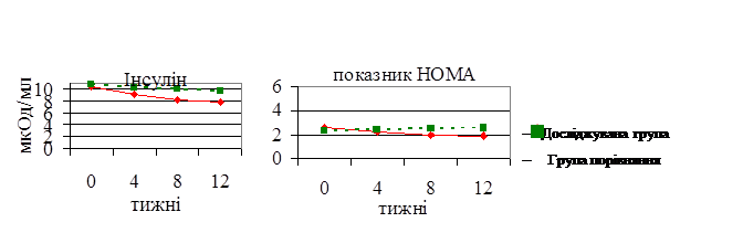 3. Гіперінсулінемія зареєстрована у 40% хворих на АГ та ІХС, ускладнених ХСН незалежно від віку. У порівнянні з хворими на АГ та ІХС, не ускладнених ХСН, визначено достовірне збільшення інсулінорезистентності (показника НОМА) на 52% (р<0,05). Пріоритетність змін з боку показника НОМА виявлено в III ФК (достовірно збільшений на 53,3%; р<0,05), ніж в II – (на 47,8%; р<0,05).