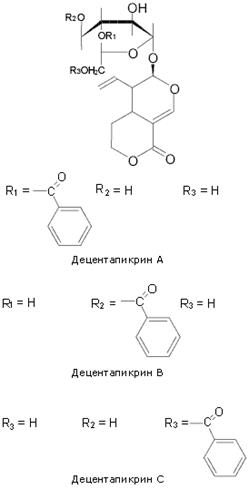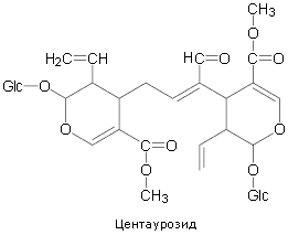 Основными действующими веществами, обусловливающими фармакологическую активность золототысячника, являются горечи - секоиридоидные гликозиды, содержание которых составляет около 0,3% (может достигать 2,4%). Горечи - безазотистые вещества, обладающие - сильно горьким вкусом. Различают чистые горечи (горькие вещества) и ароматические горечи, в состав которых входят эфирные масла. Горечи возбуждают аппетит, усиливают секрецию желудочного: сока и улучшают пищеварение. Они встречаются у представителей многих семейств, особенно горечавковых и сложноцветных. [5]