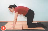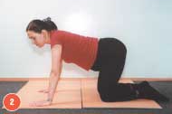Прекрасным вариантом этого упражнения служит упражнение «кошечка». Исходное положение — с опорой на колени и ладони. На вдохе опустить крестец вниз, максимально прогнуть спину в пояснице, голову откинуть назад (см. фото 2). Затем, после выдоха, возвратиться в исходное положение: голову опустить, выгнуть спину, втянуть живот, крестец поднять вверх и вперед (см. фото 3).
