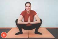 Из положения сидя (на кровати, диване, полу) поставьте одну стопу на пол (колено максимально отведено в сторону); перенесите вес на руки, поставленные вперед и чуть сдвинутые в противоположную от ноги сторону; поставьте на пол и другую стопу. Распределите вес между четырьмя опорными точками, расслабьте мышцы таза. Медленно выпрямите спину, оторвите руки от пола и соедините их перед грудью ладонями вместе (см. фото 4). Чтобы вернуться в исходное положение, повторите все описанные движения в обратном порядке.