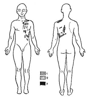 Рисунок 1. 1 — рефлекторные изменения кожи; 2 — рефлекторные изменения в соединительной ткани; 3 — рефлекторные изменения в мышечной ткани.