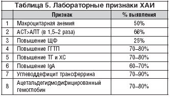 Хронический алкогольный гепатит (ХАГ) диагностируется у пациентов с нерезко выраженным цитолитическим и иммуновоспалительным синдромом, при отсутствии признаков цирротической трансформации. Клинические и лабораторные проявления алкогольного хронического гепатита аналогичны другим формам хронических гепатитов и проявляются такими неспецифическими жалобами как слабость, снижение аппетита, неустойчивый стул, тупая боль в правом подреберье и т.д. Без воздержания от приема алкоголя, как правило, ХАГ прогрессирует с исходом в цирроз печени.