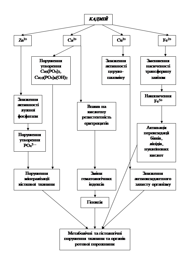 спричинив виражену атрофію епітеліального шару слизової оболонки. У пізні періоди експерименту в епітеліоцитах спостерігалися прояви білкової дистрофії та паракератозу. Кератогіалінові гранули в клітинах були відсутні. У власній пластинці слизової оболонки виявлявся набряк і виражене повнокрів’я судин. При кадміозі нами виявлено порушення структури кісткової тканини нижньої щелепи, прояви якої збільшувалися в ході експерименту. До 28-ї доби зростали ділянки зі зруйнованою кістковою тканиною. Зустрічалися гіпер- і частіше гіпомінералізовані ділянки кістки. У комірках губчастої кістки спостерігалися запальні вогнища з лімфоплазмоцитарною інфільтрацією. Ґрунтуючись на результатах власних експериментальних досліджень та даних літератури, наводимо схему токсичної дії іонів кадмію на тканини ротової порожнини (рис.1).