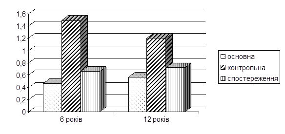 Рис.2. Приріст карієсу постійних зубів у дітей 6 та 12 років.