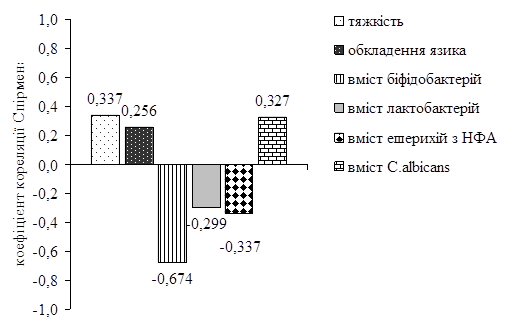Таким чином, кореляційний коефіцієнт між ступенем дисбіозу та вмістом біфідобактерій після лікування зменшився з rs