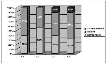 При оцінці розподілу стану МЩКТ по хребцях L1, L2, L3, L4 у обстежених з природнім перебігом післяопераційного періоду виявлено значне зростання частоти остеопенічного синдрому через шість місяців після операції (рис. 1), тоді як у жінок, що приймали гормонотерапію частота остеопенічного синдрому достовірно не змінювалась.