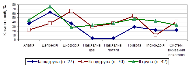 Характерною рисою досліджуваних з РО, які не притягувались до кримінальної відповідальності, є нестійка форма патохарактерологічних реакцій (54,8%, р<0,05 порівняно з І групою), депресивно-тривожна симптоматика (р<0,001), дисомнії (69,0%, р<0,05), переважання надцінних ідей іпохондричного (42,9%, р<0,001) та іншого характеру (38,1%, р<0,001), реакцій відмови або зниження прагнення до природних контактів з оточуючими (33,3%, р<0,001) та імітації (28,6%, р<0,05). При поглибленні депресивного афекту у 45,2% (р<0,05) досліджуваних розвивались апатичні стани, які тривали в деяких випадках до декількох днів, що часто призводило до прогулів, звільнення з місця роботи, усамітнення, ініціації суїцидальних намірів. Суїцидальні спроби мали місце у 4 (9,5%) досліджуваних цієї групи і здебільшого носили демонстративний характер. В клінічній картині 21,4% досліджуваних спостерігались гіпоманіакальні та ейфорічні стани (р<0,01 порівняно з І групою), пов'язані з вживанням алкоголю або токсичних речовин, нерідко з метою полегшення відчуття тривоги або дратівливості. Причому епізодичне вживання психоактивних речовин мало місце у 62,9% засуджених і 50,0% досліджуваних ІІ групи, а систематичне – у 36,1% і 33,1% (р>0,05).