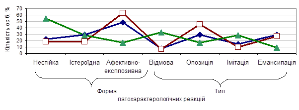 Найбільш поширеним серед засуджених є афективно-експлозивний варіант патохарактерологічної поведінки (58,8%) з переважанням реакцій активної опозиції (57,9%) та емансипації (23,8%). Протиправна агресивна поведінка таких особистостей вирізняється брутальністю, непередбачуваністю, тяжкістю наслідків. В кожному п’ятому випадку патохарактерологічні реакції засуджених мали істероїдну (21,6%) та нестійку (19,6%) форми, для яких поряд з імпульсивністю і конфліктністю характерні егоцентризм, суїцидальний шантаж, безвідповідальність, погана адаптація.