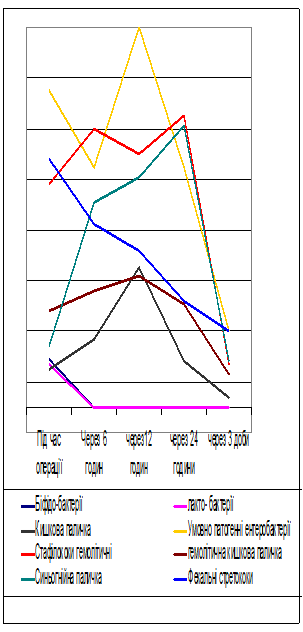 Патогенних мікроорганізмів під час втручання не висівали, а вже через 6 годин був висіяний гемолітичний стафілокок – 1,4х102