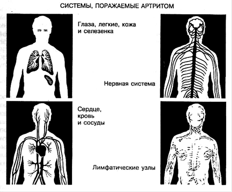 Ревматоидный артрит существенно отличается от просто артрита. Коронарная болезнь сердца - главная причина смерти людей, страдающих ревматоидным артритом, а также всего населения в целом. Поэтому можно предположить, что регулярные занятия физическими упражнениями могут оказаться эффективными с точки зрения снижения риска преждевременной смерти у больных, страдающих этим недугом. Вместе с тем ревматоидный артрит поражает не только скелетно-мышечную систему: в тяжелых случаях могут поражаться кожа, сердце, легкие, нервная система, глаза, кровеносные сосуды, селезенка и лимфатические узлы (рис.5). Некоторые осложнения, собирательно называемые системными, могут существенно повышать риск преждевременной смерти.