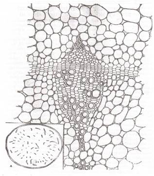 На поперечном срезе корневища видна слоистая перидерма. Корневище имеет пучковый тип строения. Проводящие пучки открытые, коллатеральные, веретеновидные, расположены кольцом, ориентированы к периферии корневища флоэмой и к центру – ксилемой. Возможно наличие второго кольца более мелких проводящих пучков, в которых флоэма ориентирована к центру, а ксилема – к периферии. Паренхима корневищ состоит из крупных клеток, заполненных крахмалом. Крахмальные зерна простые, округлые или овальные, 5 – 20 мкм в диаметре (Рис. 8).