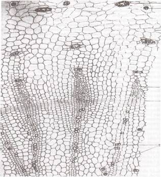 Клетки сердцевидных лучей четырехугольные, вытянутые имеют утолщенную пористую оболочку ( Рис.11).