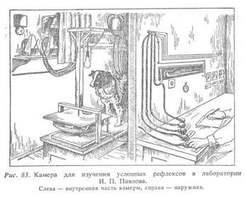 Для формирования условных рефлексов необходима определенная обстановка. Быстрее, легче условные рефлексы формируются при отсутствии посторонних раздражителей. В связи с этим в лаборатории И. П. Павлова изучение условных рефлексов проводили в специальной камере, изолированной от окружающего мира (рис. 83).