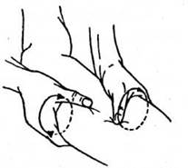 При колоподібному вилкоподібному масуванні кисті рук містяться по обох сторони хребетного стовпа і роблять кругові рухи убік мізинця (мал. 45). Великі пальці при цьому відіграють роль опори.
