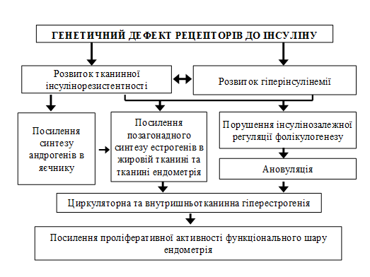 Літературні дані останніх років свідчать, що у виникненні ІР значну роль відіграє генетичний дефект рецепторів до інсуліну (R. Ross et al., 2002), а аналіз отриманих нами результатів дав змогу уявити патогенетичну схему розвитку ГЕ у жінок у пременопаузі на тлі МС наступним чином (рис.1). Основними ланками патогенезу розвитку НГЕ у жінок із МС у пременопаузі є: реалізація генетичного дефекту рецепторів інсуліну, розвиток тканинної гіперінсулінемії (ГІ) та ІР, порушення інсулінозалежної гонадотропної регуляції овуляції, посилення під впливом ІР синтезу андрогенів у яєчнику, а також посилення позагонадного синтезу естрогенів у жировій тканині та тканині ендометрія, підвищення проліферативної активності функціонального шару ендометрія під впливом гіперестрогенії.