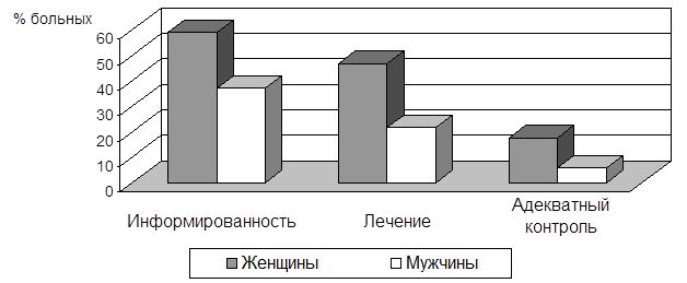 Артериальная гипертония – самый распространенный сердечно-сосудистый синдром во всем мире.Поданным обследования репрезентативной выборки (1993 г.) распространенность АГ в России составляет среди мужчин 39,2%, а среди женщин – 41,1% [74]. Женщины лучше мужчин информированы о наличии у них заболевания (58,9 против 37,1%), чаще лечатся (46,7 против 21,6%), в том числе эффективно (17,5 против 5,7%) (рис. 1)