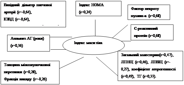 Виявлений взаємозв’язок між підвищенням індексу маси тіла та: чутливістю тканин до інсуліну (r=0,24), ліпідним спектром крові, зокрема гіпертригліцеридемією (r=+0,33), функцією ендотелію (ендотелійзалежною вазодилатацією-(r=-0,44), ендотелійнезалежною вазодилатацією (r=-0,26), кількістю уражених коронарних судин (r=+0,24), показниками системного запалення