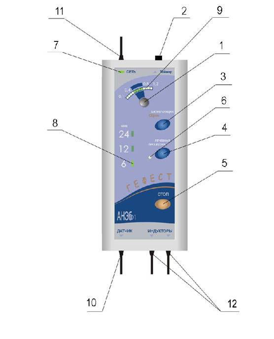 А - верхняя, передняя панель: 1- регулятор; 2- установка таймера; 3 -кнопка "биорегуляция / сброс"; 4- кнопка "лечебная процедура"; 5 - кнопка "стоп"; 6 - индикатор включения индукторов; 7 - индикатор включения аппарата в сеть; 8 - индикатор таймера; 9 - индикатор обратной связи; 10 - гнездо включения датчика обратной связи; 11 - гнездо включения блока питания; 12 - гнезда включения индукторов.