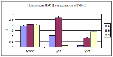 Представлені дані демонструють істотні розходження вегетативної відповіді у постраждалих, що свідчить про участь автономної нервової системи в розвитку адаптаційних реакцій на передопераційному етапі. Порівняння значень логарифмів показників потужності осциляцій, зумовлених активністю симпатичного й парасимпатичного відділів ВНС, вірогідно підтверджує різний ступінь залучення її відділів у регуляцію серцевої діяльності. У групі А відзначалася виражена в 6 разів, у порівнянні с групою В, та в 2 рази, в порівнянні с групою С (р<0,05) відповідно перевага тонусу симпатичної нервової системи. У групі С активність парасимпатичної нервової системи була підвищена в 7,7 рази, у порівнянні с групою А, та в 1,8 рази, у порівнянні с групою В (р<0,05). При аналізі потужності високочастотних осциляцій відзначене стійке підвищення активності парасимпатичної нервової системи в міру поглиблення тяжкості стану постраждалих і ступеня ушкодження головного мозку.
