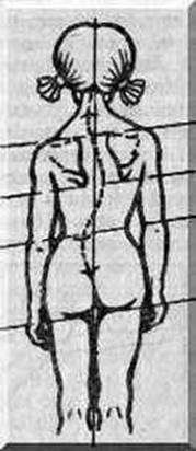 Iстепень сколиоза характеризуется простой дугой искривления, позвоночник при этом напоминает русскую букву «С». Торсионные изменения клинически слабо выражены. Клинические проявления сколиоза наиболее выражены в положении стоя (при разгрузке, например в горизонтальном положении, они уменьшаются).