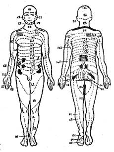 Сегментарный массаж при заболеваниях желудочно-кишечного тракта усиливает действие медикаментозных и других лечебных средств, ускоряя тем самым процесс выздоровления. Согласно схеме, основные участки, реагирующие на патологию при желудочно-кишечных заболеваниях, расположены слева — это сегменты D8 — СЗ. При данном типе заболеваний рефлекторные изменения происходят в разных участках тканей.