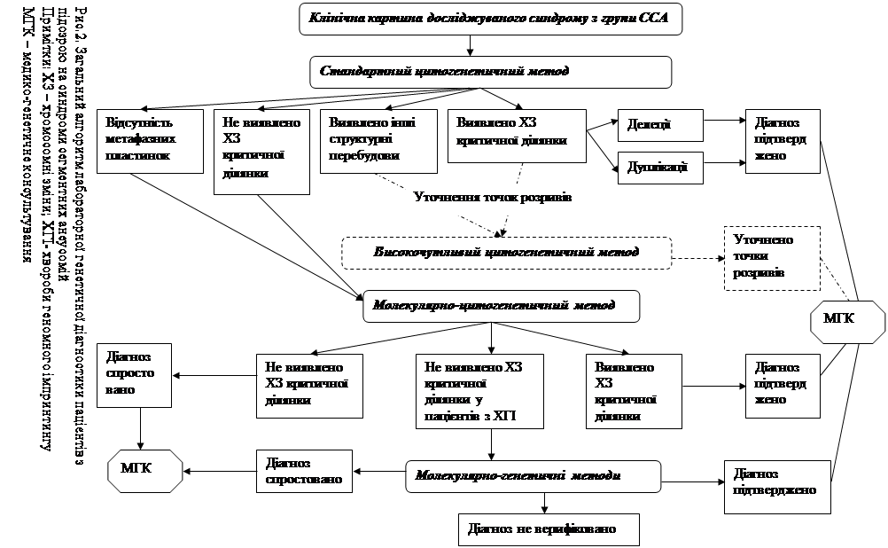При ССА має місце і цитогенетична варіабельність, яка пов’язана з різною довжиною делеції або дуплікації певних ділянок хромосом, а також з різним батьківським походженням мікроперебудов, які і призводять до розвитку певних клінічних ознак синдрому (Бочков, 2001; Пішак, 2004; Morrisetal., 2003). Тому швидкість та якість підтвердження діагнозу залежить від чутливості та специфічності застосованих методів. Так, деякі пацієнти з ССА мають значну за розміром делецію/дуплікацію, яку видно у світловий мікроскоп, хоча, у більшості випадків каріотип пацієнтів з підозрою на ССА відповідає нормі. У зв’язку з цим для остаточного підтвердження діагнозу ССА необхідним є використання молекулярно-цитогенетичних технологій, а саме методу флуоресцентної insitu гібридизації (FISH), який є одним із найбільш високоспецифічих методів діагностики ХП в сучасній цитогенетиці (Юров, 2000). В Україні молекулярно-цитогенетичне підтвердження/спростування діагнозу ССА досі не проводили, а верифікація діагнозу ССА базувалася лише на клінічному досвіді лікарів.