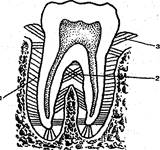| Рис. 3. Строение периодонта: 1 —зубо-альвеолярные волокна; 2 — межзубные (межкорневые) волокна; 3 — зубо-десневые волокна. |