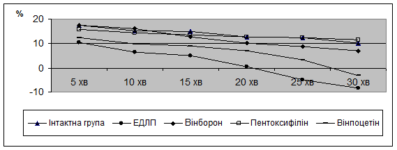5. При експериментальній дисліпопротеїдемії спостерігається прогресивне зниження об’ємної швидкості мозкового кровотоку в внутрішніх сонних артеріях з 10,34±0,50 % через 5 хв до мінус 8,28±0,39 % через 30 хв., проти більш стабільного зменшення ОШМК з 17,56±0,29 % до 10,10 ± 0,22 % у кролів інтактної групи за цей самий проміжок часу.